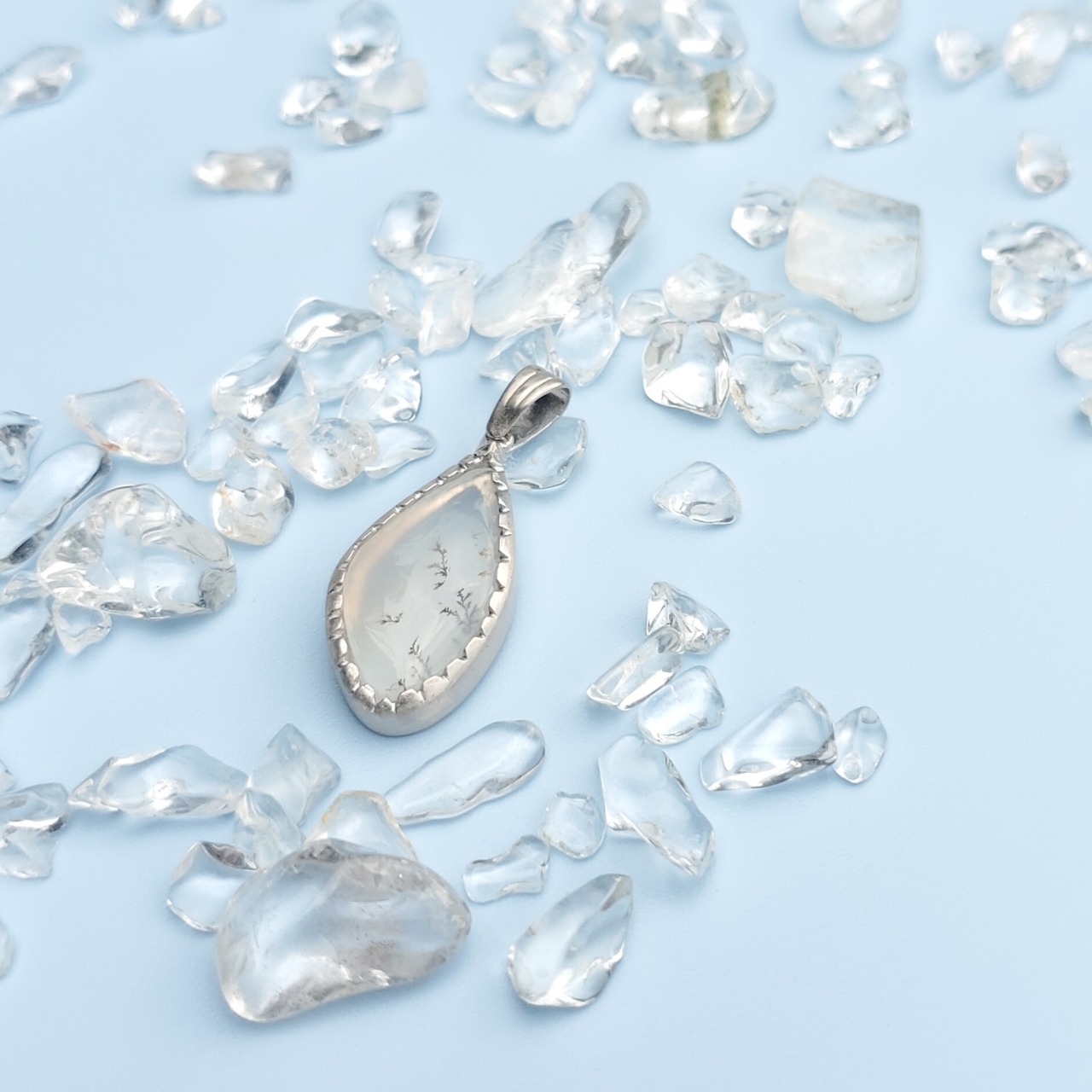 デンドリックアゲートを石に合わせて手作りで制作したシルバー枠でペンダントに仕立てた1点モノのペンダントです。